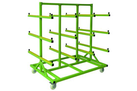 玻璃推車 玻璃推車,是一種跟倉儲貨架配套非標定制的配套工具,專門用于做玻璃的搬運的物流工具。 產品特點 1.噪音小,搬運中發出聲音小 2.有一...